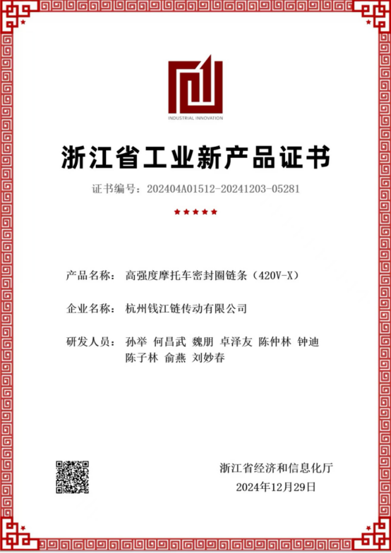 Para resolver os problemas acima, a Qianjiang Chain Transmission Co., Ltd. desenvolveu a "Corrente de anel selado a óleo para motocicleta de alta resistência (Modelo 420-O/X)". Ao otimizar o projeto da estrutura da corrente, usar materiais de alta qualidade e melhorar os processos de produção, a empresa aumentou a resistência e a resistência ao desgaste da corrente de anel vedado a óleo da motocicleta, estendeu sua vida útil, melhorou o desempenho do anel vedado a óleo e, assim, aumentou a segurança e a estabilidade da operação da motocicleta.
