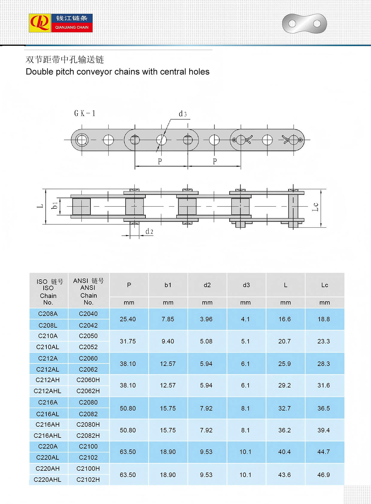 As correntes transportadoras de passo duplo com furos centrais são uma solução inovadora projetada para aplicações eficientes de manuseio e transporte de materiais. Essas correntes se destacam pelo seu design exclusivo, que inclui dimensões de passo ampliadas e furos centrais estrategicamente posicionados. Este design reduz o peso enquanto mantém alta resistência à tração, tornando-os ideais para transportar materiais leves, porém volumosos, por longas distâncias sem comprometer o desempenho. Os furos centrais também permitem a fácil fixação de luminárias ou acessórios personalizados, aumentando a versatilidade em vários setores.